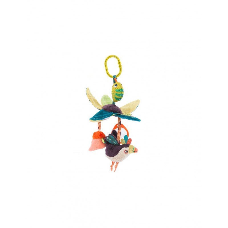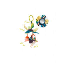 A suspendre au cosy, à la poussette ou au parc, ce jouet propose de nombreux accessoires pour amuser et divertir votre enfant : des feuilles contenant du papier crissant, un prisme, un petit toucan, un caméléon et des fleurs contenant un grelot.